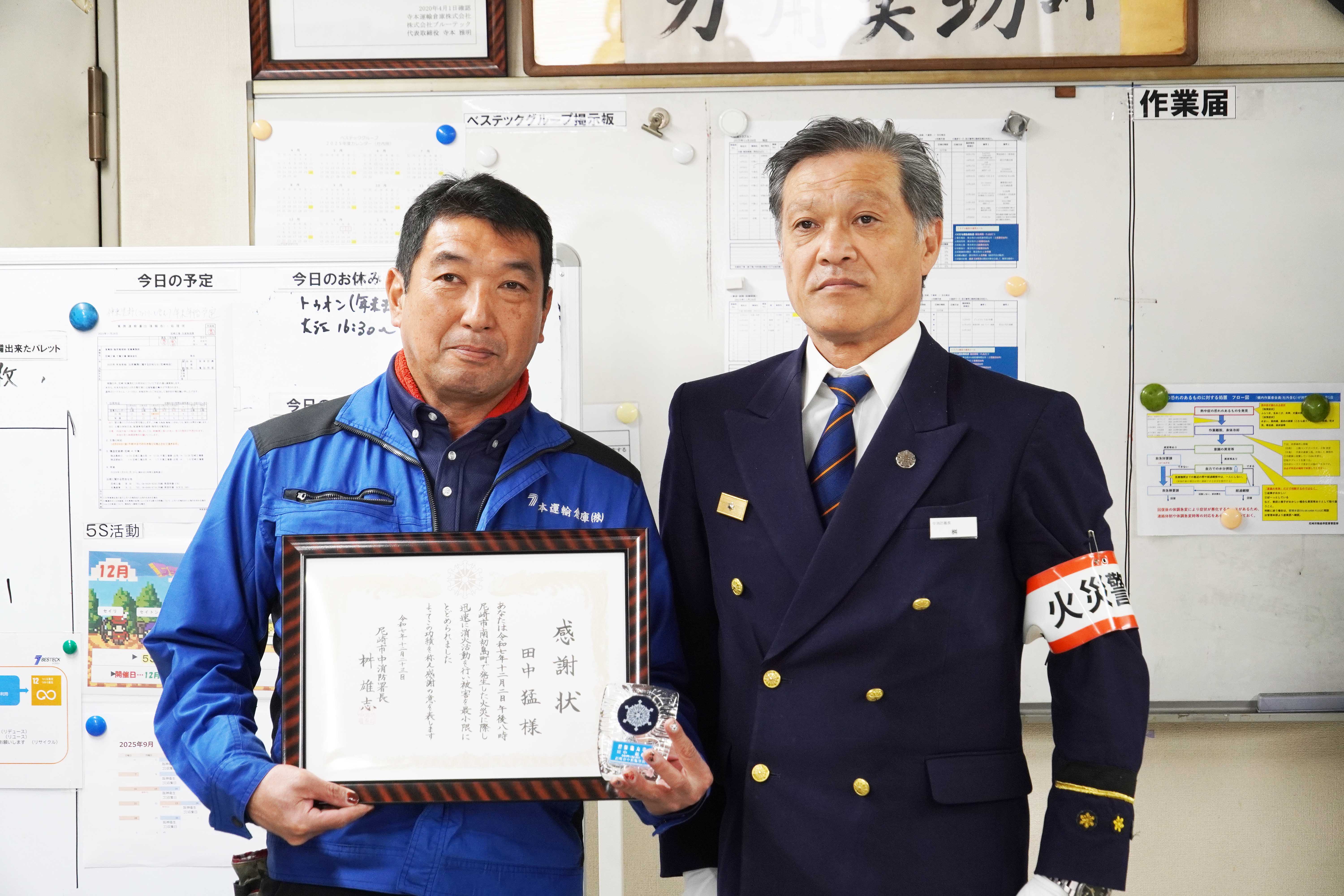 寺本運輸倉庫従業員が消防から表彰 寺本運輸倉庫㈱(寺本雅明社長、兵庫県尼崎市)のグループ会社・㈱ブルーテックの田中猛さんが消防署より表...